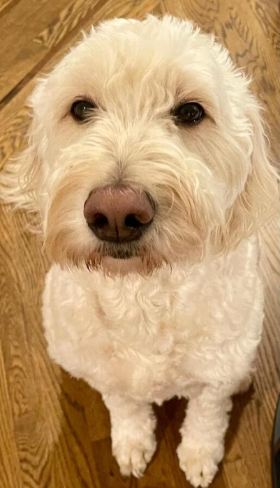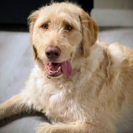 Charlie is soooo sweet, and gets along with other dogs (German shepherds, dachshunds, etc) and doesn't mind cats. He is crate trained and is in it when he is left alone. He is a handsome, full size Goldendoodle. Charlie has lost 20 pounds and he loves to romp and play, so he would benefit from a fenced in yard or a family committed to giving him the daily exercise he craves. He does seem to pull on leash (only when he sees another dog), but our volunteer had just met him and he wanted to sniff everywhere, but some work will cure that. According to Charlie's past family, he is a happy go lucky dog who just fits in and goes with the flow. Charlie is currently known to be a counter surfer and that is a work in progress. Charlie has been groomed consistently his whole life and has been well cared for.