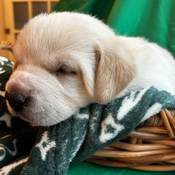 Chase is one of the two pups in the litter who looks just like mom, Bonnie. He has that traditional English field Lab look. His temperament so far is fairly laid back. While his siblings may be wrestling all around him he prefers to take a well deserved nap as it is so hard to be a puppy.